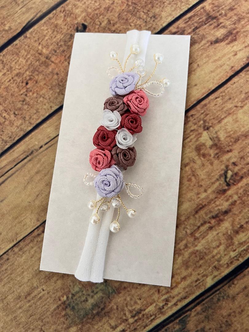 A faixa é feita a mão,podendo apresentar variaçoes nas sequências das flores.